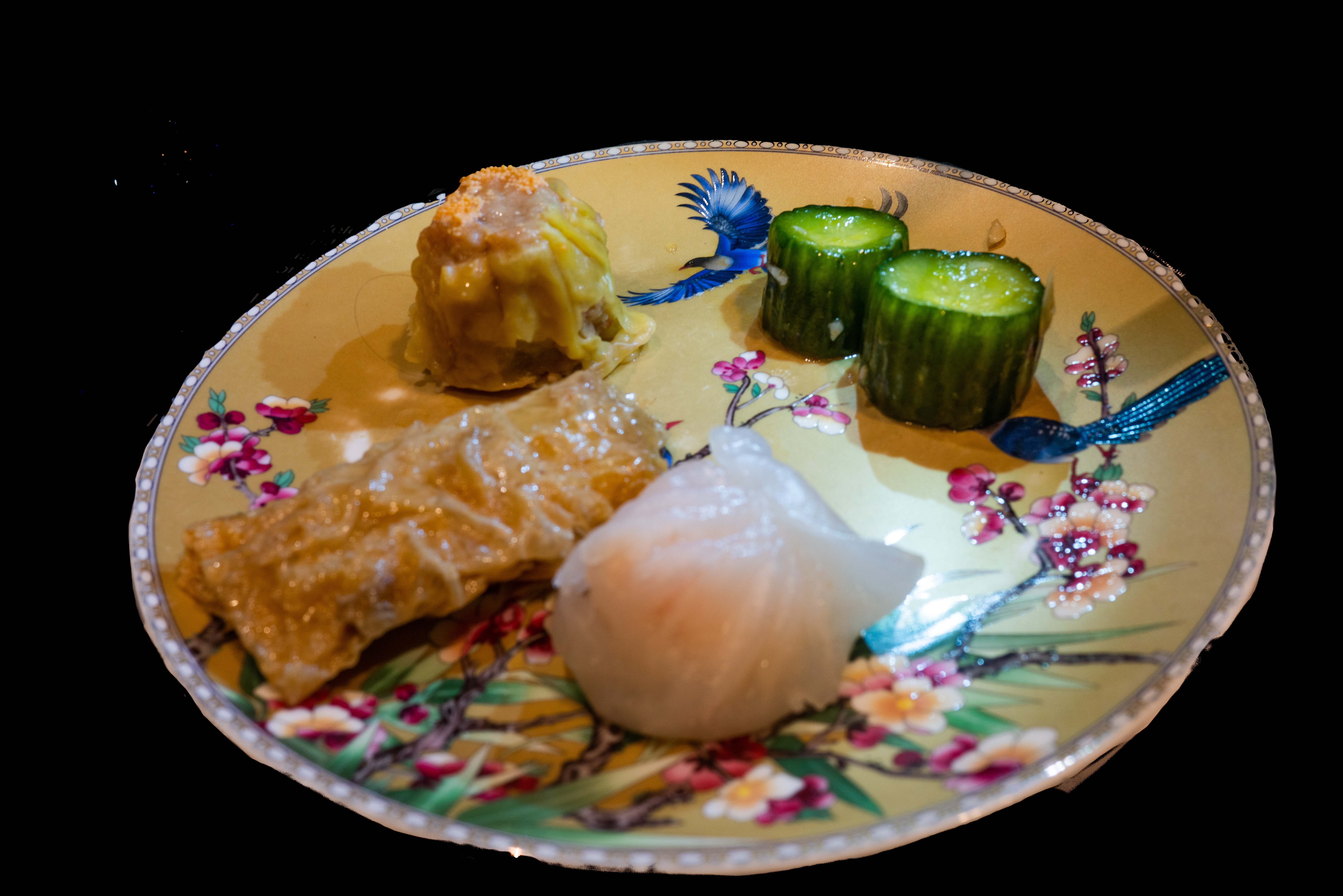 The third set of dishes explored a range of dim sum’s techniques and flavors: crispy pork belly and roast pork, deep fried crab ball, braised eggplant, and (for the adventurous) steamed chicken claws. Each dish was delicious, and the medley of flavors and textures illustrated the skills of the chefs in the Han Palace kitchen. Champagne continued be a wonderful match for these tempting dishes.